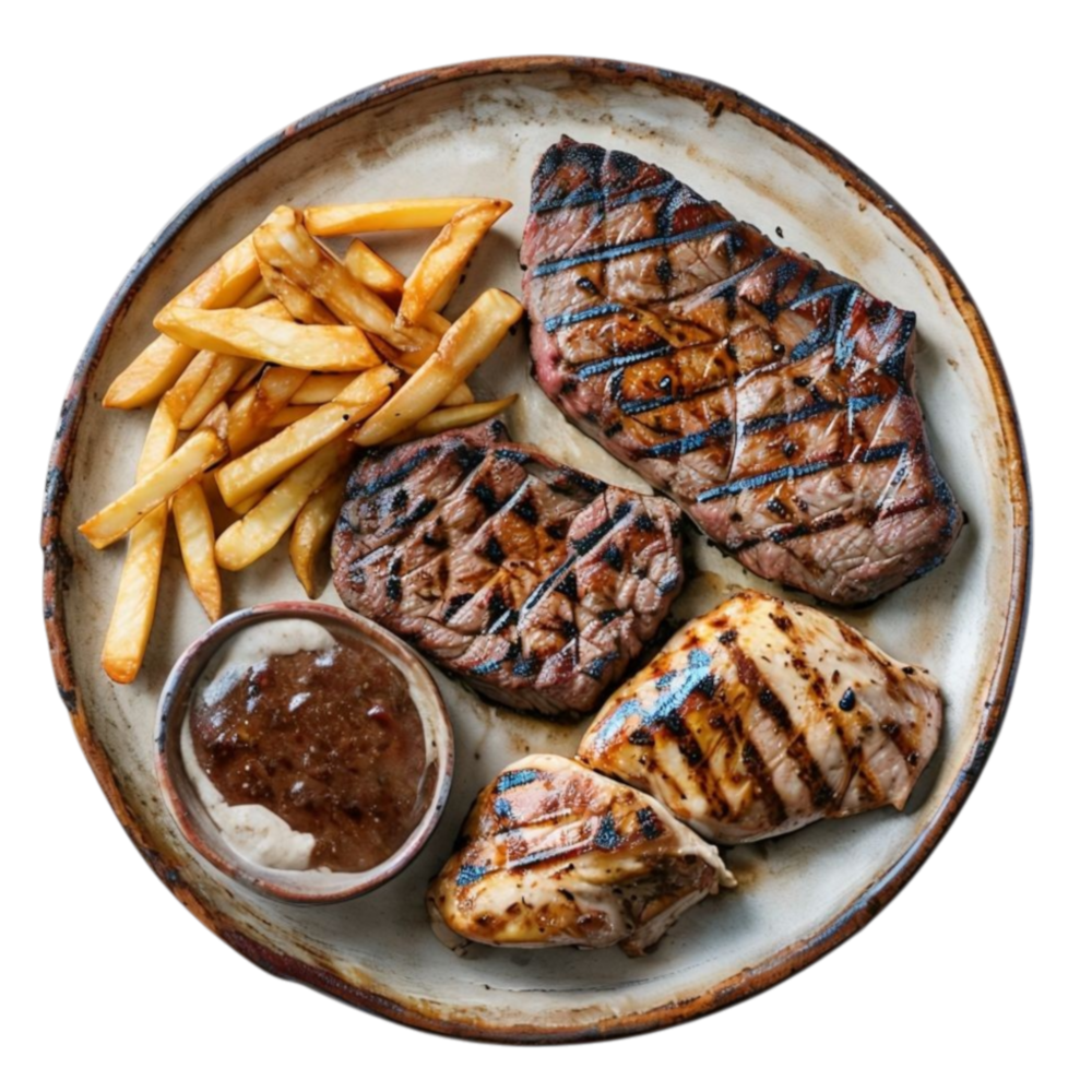 Una combinación equilibrada de tres tipos de carne cuidadosamente seleccionada, donde dos cortes jugosos de ternera se fusionan con tiernas piezas de pollo marinado. Cada bocado ofrece una textura robusta y sabores intensos, realzados por el dorado de la parrilla que aporta matices ahumados irresistibles. Acompañada de crujientes patatas fritas y una salsa casera que envuelve el conjunto con notas cremosas y especiadas, esta parrillada se convierte en una experiencia culinaria llena de satisfacción y calidez. Visualmente, el plato exhibe tonos dorados y marrones, con la jugosidad de las carnes contrastando con la textura crocante de las patatas, invitando a degustar un festín para los sentidos.