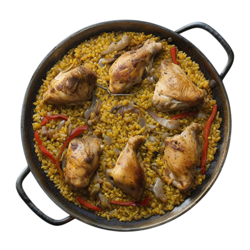 Bomba rice is slowly cooked with a sofrito of green and red peppers and onion, prepared in extra virgin olive oil to enhance every nuance of the grain. The rich golden chicken broth infuses the rice with deep, comforting flavor. Tender chicken pieces blend seamlessly into the mix, adding satisfying texture and warmth. Each serving, in rustic golden and earthy tones, evokes a sense of nostalgia and comfort, offering a visually inviting dish that celebrates traditional home-style cooking.