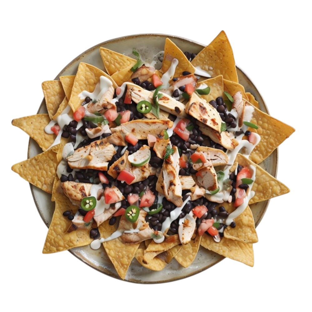 Crispy corn tortilla chips, perfectly golden, form the base of a flavorful feast. A generous layer of melted cheese drapes warmly over them, coating every corner. Tender pieces of slow-cooked chicken, creamy beans, diced fresh tomato, and red onion blend with the brightness of chopped parsley. A dollop of sour cream adds a rich, velvety touch, while jalapeños crown the dish with a vibrant and spicy spark. A plate where texture, color, and flavor come together in every bite.