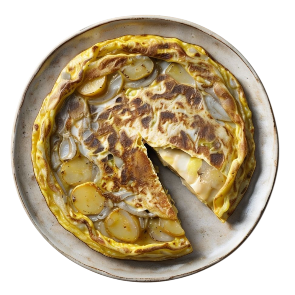 A classic Spanish omelette made with fresh eggs, tender potatoes, and caramelized onions, slowly cooked to achieve a soft, juicy texture with a lightly golden exterior. Each bite reveals a perfect balance of creaminess and traditional flavor, evoking the essence of home and simplicity in a dish full of warmth and comfort.