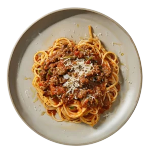 Spaghetti al dente con salsa de tomate, carne de ternera, pimiento rojo y verde, todo elaborado con aceite de oliva virgen extra y coronado con queso parmesano rallado.