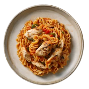 Pasta al dente acompañada de tomate, pimiento rojo y verde, y tiernos trozos de pollo.
